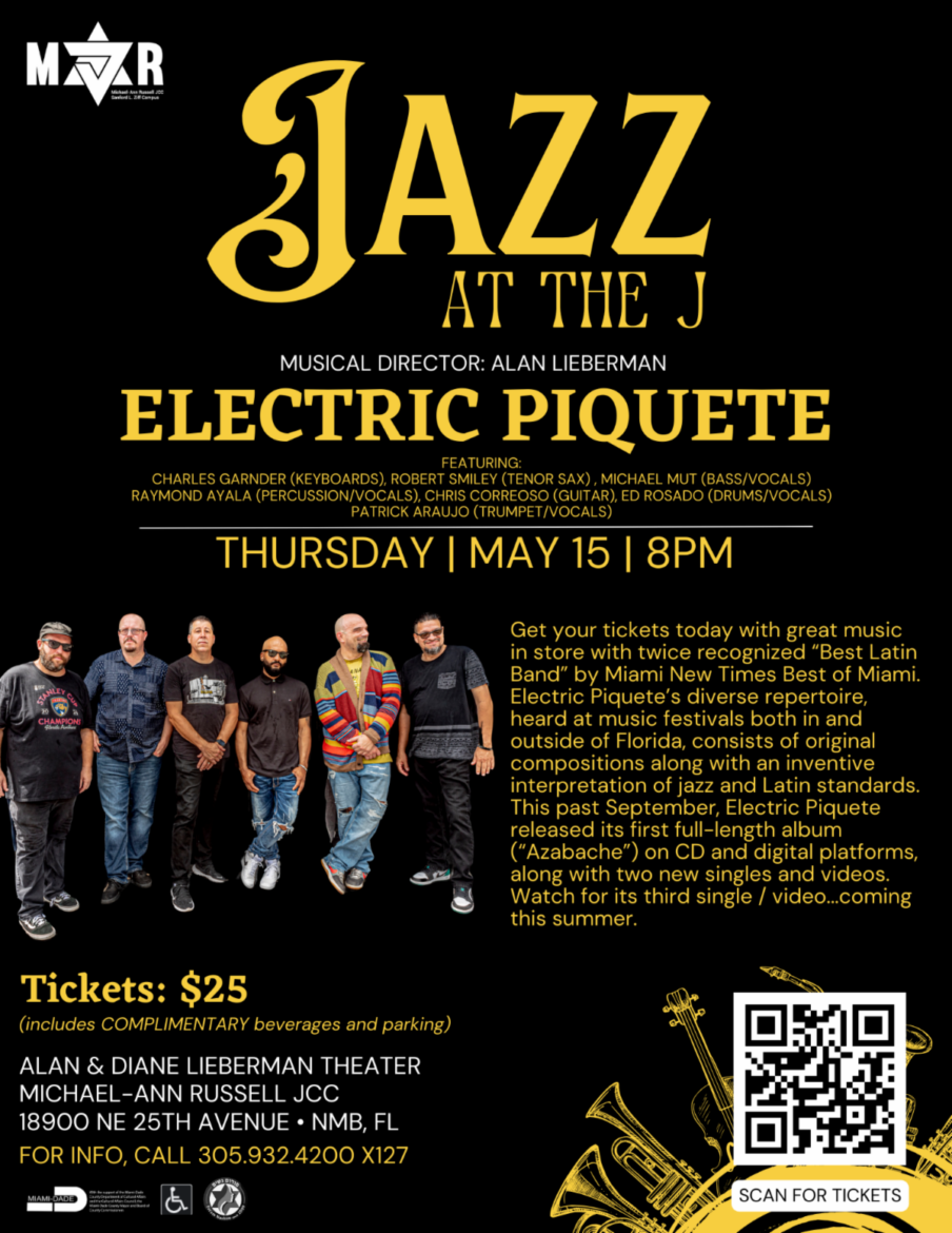 Get your tickets today with great music in store with twice recognized “Best Latin Band” by Miami New Times Best of Miami. Electric Piquete’s diverse repertoire, heard at music festivals both in and outside of Florida, consists of original compositions along with an inventive interpretation of jazz and Latin standards. This past September, Electric Piquete released its first full–length album (“Azabache”) on CD and digital platforms, along with two new singles and videos. Watch for its third single / video…coming this summer.